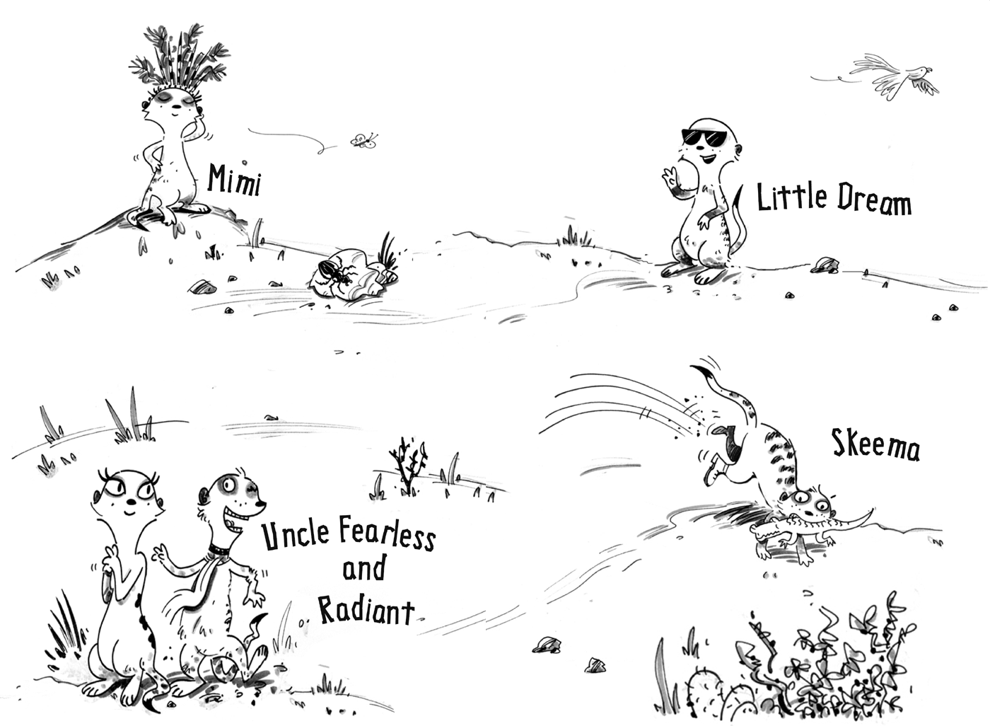 Mimi’s big brother, Skeema, pricked up his ears and looked sideways at Uncle. Being rather keen on plans and schemes himself, he too was curious to know what Fearless was up to. “Pounce, eh?” thought Skeema. “Old battler…? Hmmm. I wonder if he’s planning to have a fight with another meerkat mob. Prrrrr! Perhaps he’s found out that the Ruddertails are planning another attack on Far Burrow!”