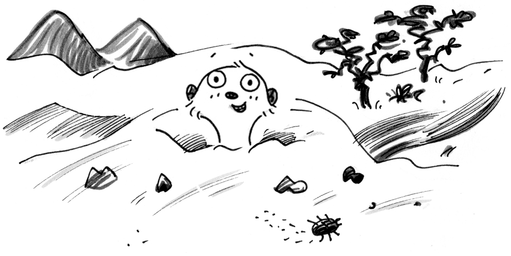 With Mimi on guard, the others could get their heads down and dig with a will, but the pickings were thin. Before the rains came, food was always scarce. The damp places, where the juiciest bugs and lizards and scorpions love to cool themselves, lay far below the surface and were hard to sniff out.