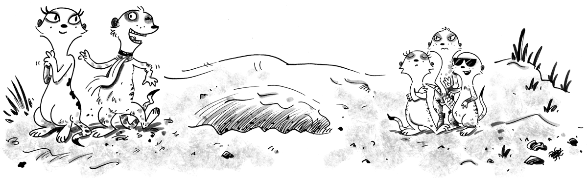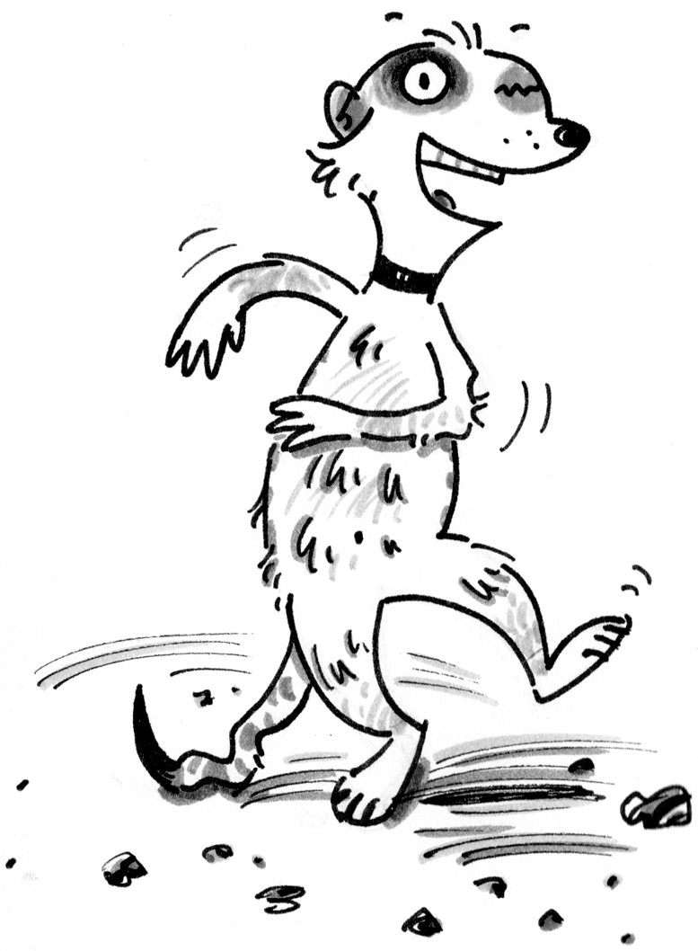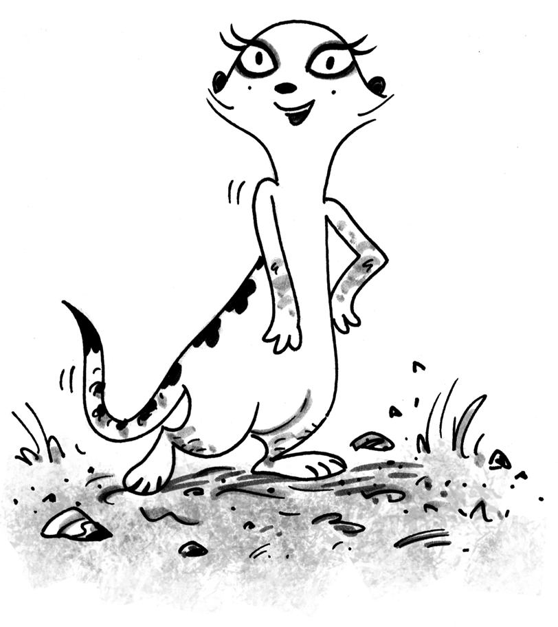 The stranger was a fabulously fluffy female meerkat. She was tall and youthful, and when she turned, she showed very pretty, regularly-spaced dark patches down the sandy fur of her back. She had clearly lost weight and condition, but not her dignity. Her eyes were very deep and dark and her gaze was steady. When she saw how anxiously the kits looked at her, she almost turned and went back the way she had come. But then she seemed to check herself and stepped forward and spoke up boldly. “What ho, Fearless, old thing,” she said. She sounded very grand and hearty. “I hope this isn’t an awkward moment. But I really don’t think I can keep myself a secret for much longer. There! I’ve done it now, haven’t I?”
