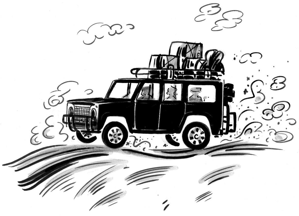 “No, no. The Click-clicks have gone, I’m afraid,” said Uncle, staring outwards. “The rains will be here soon; I can smell ’em. And Blah-blahs get very nervous about storms, don’t you know. Those feeble pointy mounds of theirs won’t keep them safe from sky-crash and fizz-fire. That’s why they’ve all jumped into their Vroom-vrooms, d’you see? I expect they’ve gone to find a safer place to live.”