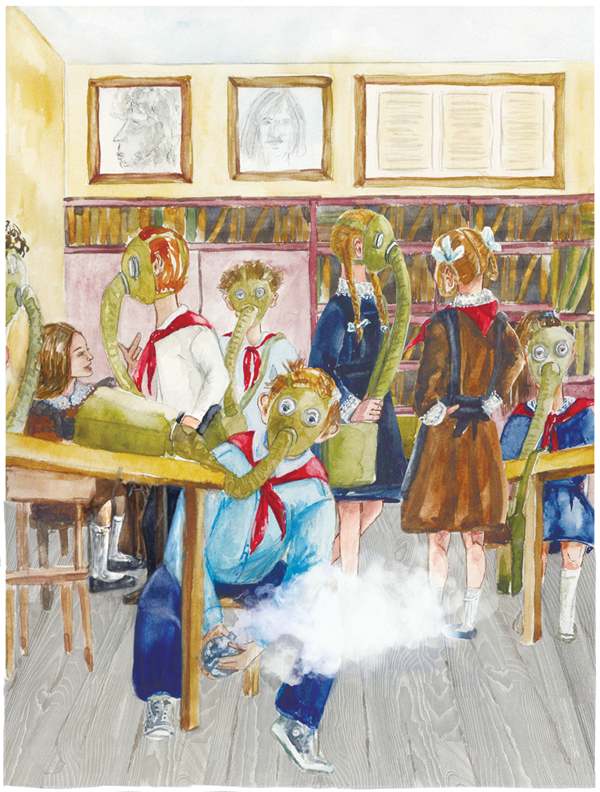 Тем временем Света, лежа на полу своей комнаты, а точнее закутка за сервантом, превращавшим однокомнатную квартиру в условную двушку, вырезала из журнала картинку с фотографией «гриба» ядерного взрыва. Цветными карандашами она срисовала из учебника человека в противогазе и, подумав, дорисовала ему косички. Затем, уже так – для красоты, закрасила акварелью фон плаката и теперь сушила его феном.