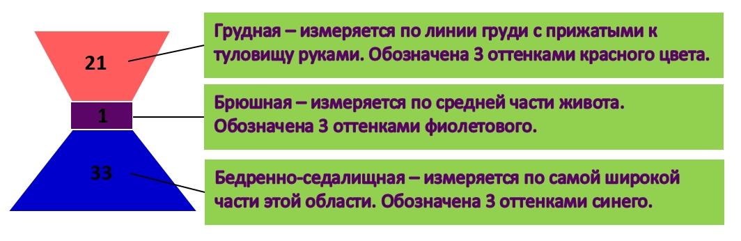 3 квадрата, приведенные в таблице (пронумерованные сверху), объединяют типы фигур по признаку объема талии: