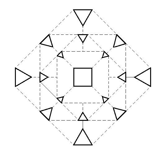 Выведя на планшет карту расположения зданий комплекса, лейтенант покачал головой. Что-то такое расположение значит, вот только что? В центре находилось кубическое здание из того же бело-зеленого камня, пятьдесят на пятьдесят на пятьдесят метров, по его углам были четыре пирамиды, отстоящие на семьдесят метров, создавая большой квадрат. По сторонам этого большого квадрата стояли четыре пирамиды побольше, образующие еще один квадрат, по углам которого тоже находились четыре пирамиды. А завершали картину еще четыре, самые большие. Опять же стоящие на некотором отдалении от сторон последнего квадрата. Каждая пирамида была связана подвесными мостиками из непонятного белого материала или с тремя другими (последний ряд), или с пятью (средние ряды), или с шестью (первый ряд). На уровне мостиков каждую пирамиду окружал парапет в полметра шириной. Впрочем, называть мостиками эти ровные белые, кажется, пластиковые полосы без поручней было не совсем верно, но как их еще назвать Карпин просто не знал.