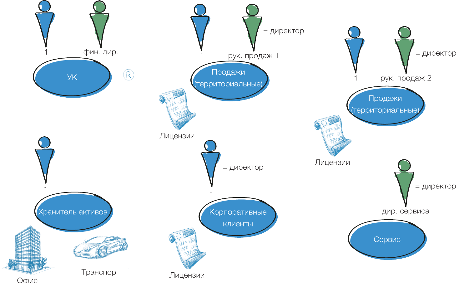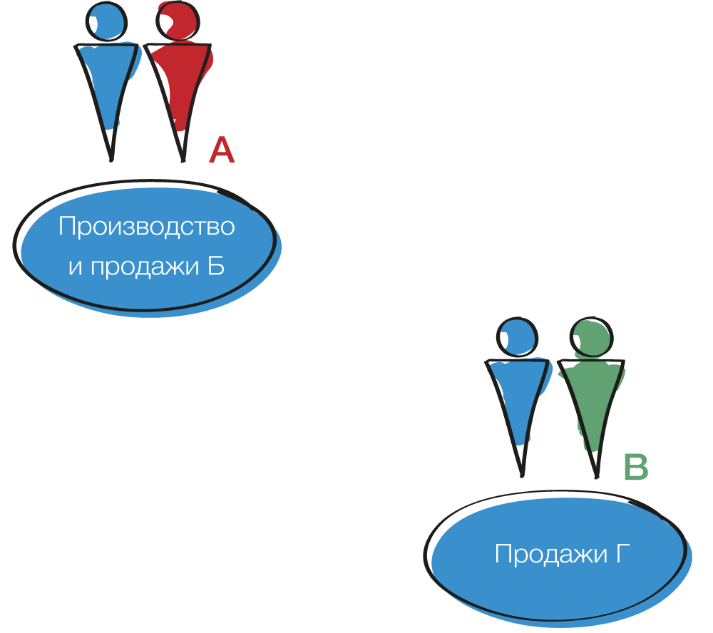 В связи с этим поделить владение компаниями между несколькими собственниками обычно не очень сложно (как восстановить равновесие и реальные договоренности, мы пока не говорим – об этом основная часть книги). Стараемся следовать естественному делению функционала компаний и Основателей. Совпадения на 100 % хочется, но не требуется, да и в принципе это не всегда возможно.