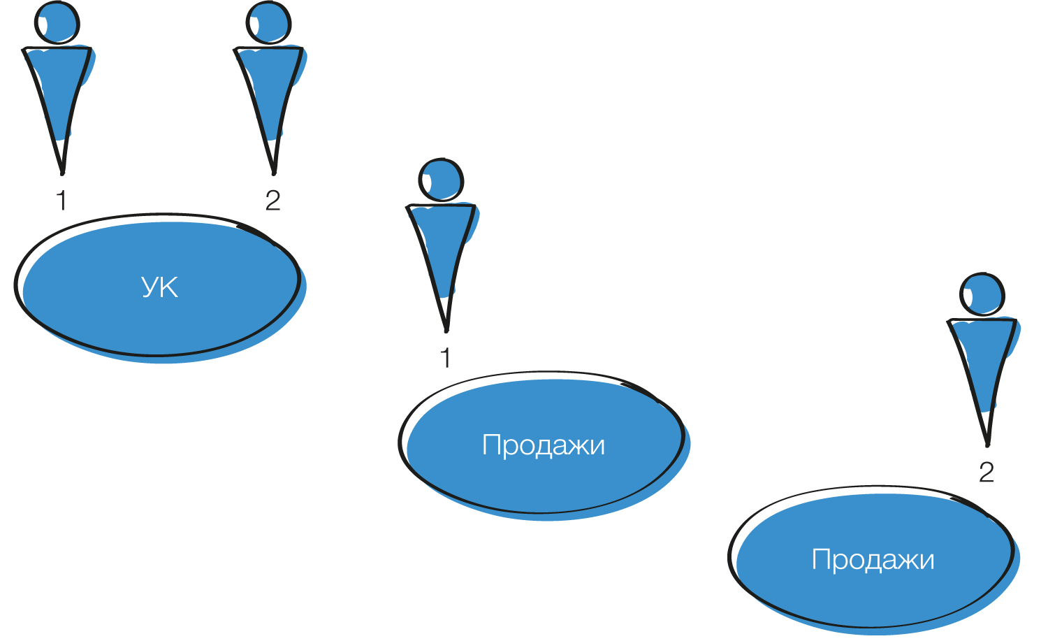 На приведенном примере компания с двумя собственниками превратилась в Группу компаний на основании каналов продаж – Москва (1) и регионы (2), в каждой из которых по одному из Основателей.