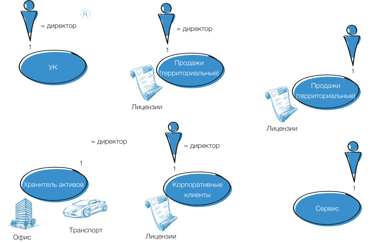 Если вы интуитивно согласны с необходимостью решения задачи нормализации фактических и юридических зон ответственности, то владение Группой компаний из нашего примера могло бы выглядеть вот так: