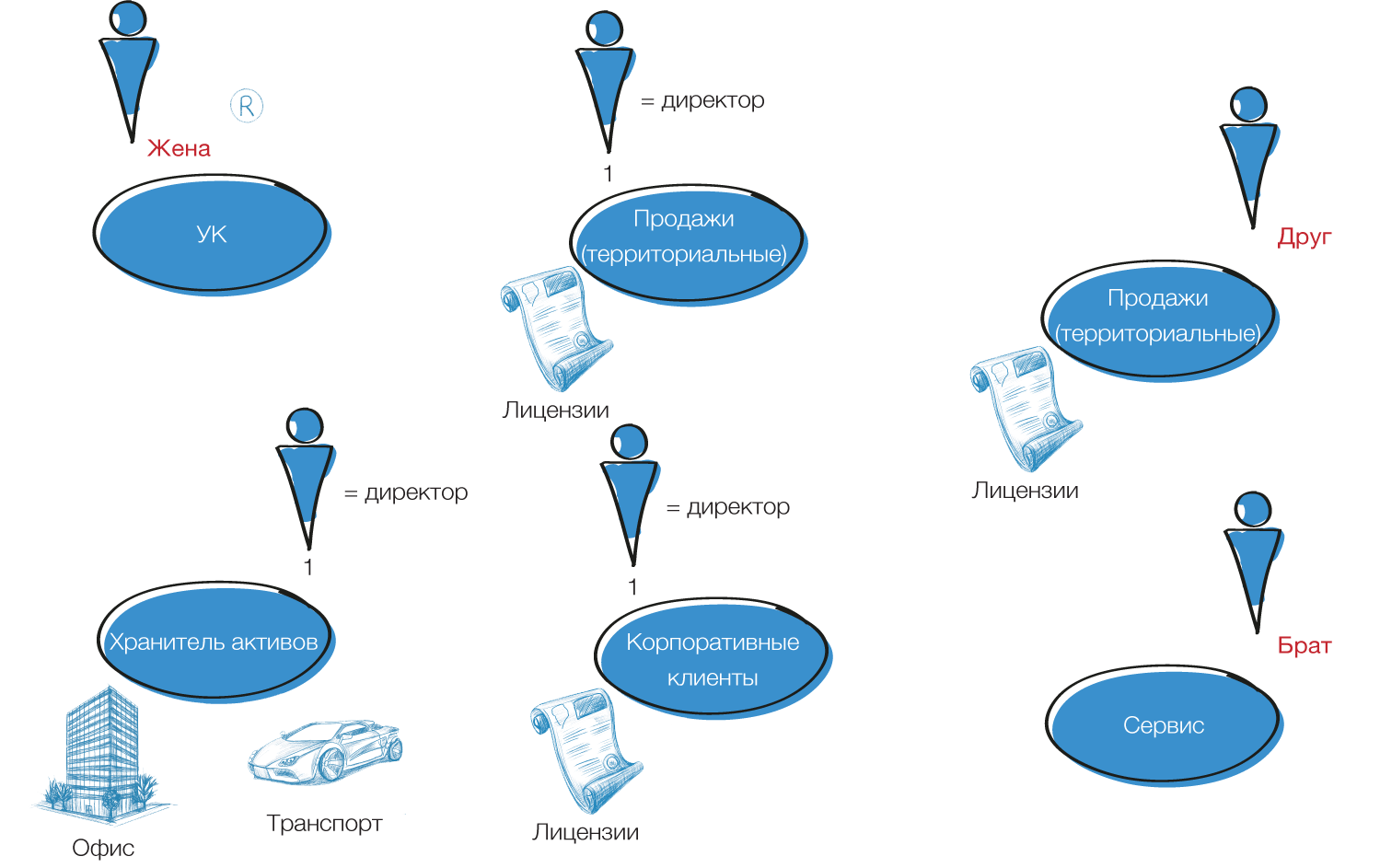 Под давлением внешних обстоятельств или под воздействием уговоров бухгалтера/финансового руководителя структура владения пополнится традиционными для российского бизнеса персонажами: родственник (в том числе по линии супруга, где в качестве «бонуса» разные фамилии), друг, «одно-» кто-нибудь (-классник, – группник…), доверенный сотрудник (водитель, секретарь, юрист, бухгалтер). То есть номиналами, реально не участвующими в бизнес-процессах, упакованными в конкретное юридическое лицо.