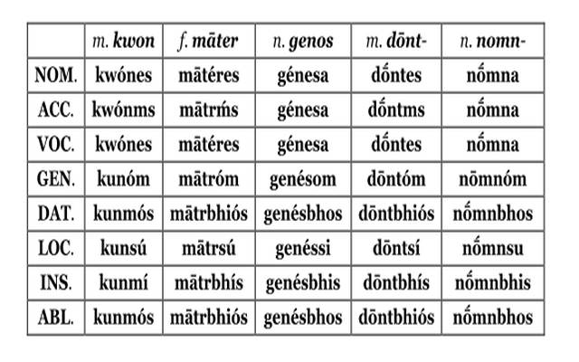 Склонения не сильно поменялись, в латыни и санскрите в целом близки к праарийским, только в латыни вместо -os пошло -us.