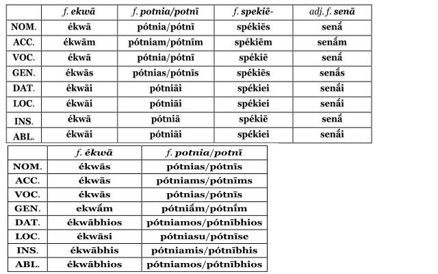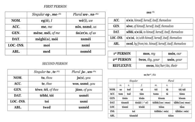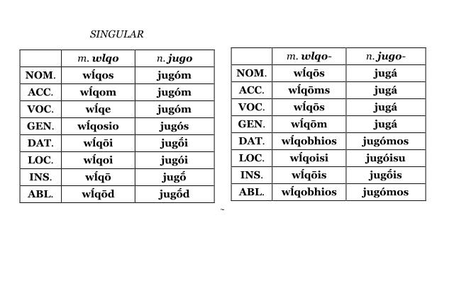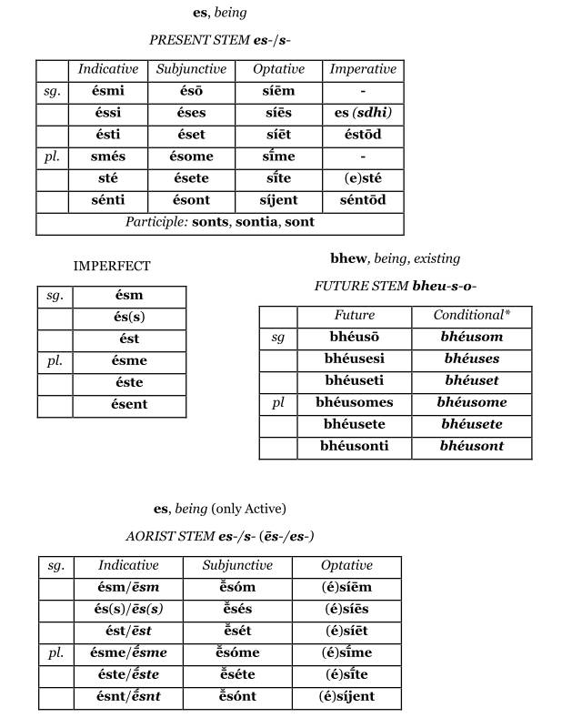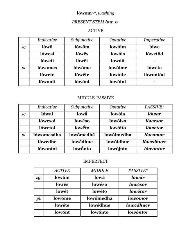Привожу здесь и далее парадигмы по книге: Carlos Quiles, Fernando López-Menchero. A grammar of modern Indo-european. Version 5.00 (April 2011) (лицензия Creative Commons Attribution-ShareAlike 3.0). Это основанный на индоевропейском конланг, где различные гипотезы приведены по крайней мере в практическую языковую систему.