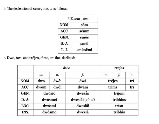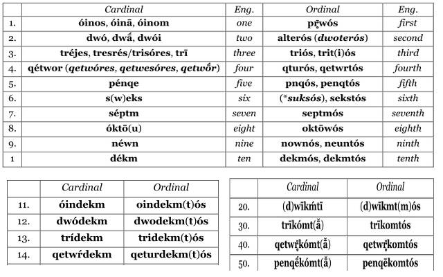 Имелось, как и в санскрите, специфическое склонение числительных от 1 до 3:
