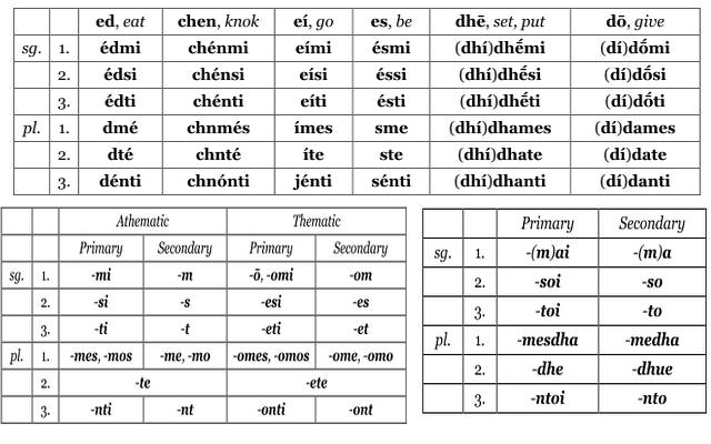 Два залога – активный и средне-пассивный. Четыре модальности: индикатив, императив, условное и оптатив. Признак императива – чистый корень без модификаций; условное наклонение имеет суффиксы -ā, -ē, и -s); оптатив имеет суффикс -iē/-ī либо -oi.