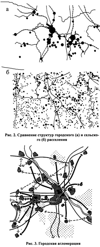 Исторически формировавшийся процесс расселения предопределял существование двух основных видов расселения: городского, связанного с возникновением городов и поселений городского типа, и сельского, связанного с развитием сел, деревень, хуторов и фермерских хозяйств. При этом в составе городского расселения выделялись две формы: сосредоточенная или концентрированная, характеризующаяся преимущественной концентрацией населения в больших и крупных городах и зонах их влияния, и рассредоточенная или дисперсная, в которой основная часть населения расселяется в большом числе средних и малых городов.