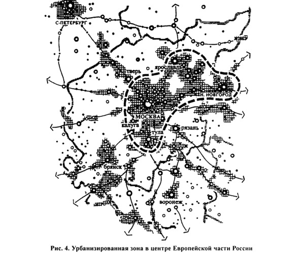 На рисунке 4 показана урбанизированная зона, расположенная в центре Европейской части России. Эта зона соответствует концепции перспективной структуры расселения, которая является системой научно -проектных работ по градостроительству. Она включает в себя прогнозную и проектно -планировочную документацию, охватывающую все объекты территориального планирования, начиная от страны и заканчивая микрорайоном. На самом высоком уровне разрабатываются стратегические прогнозы расселения, которые учитывают развитие производительных сил страны и ее территориальное размещение.