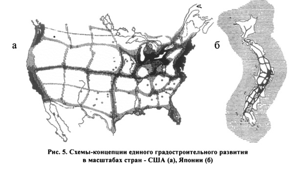 Рис. 5. Схемы концепции единого градостроительного развития в масштабах стран – США (а), Японии (б) в наиболее общем виде формирование сети поселений на территории страны реализуется в генеральной схеме расселения. Её основная градостроительная цель состоит в создании планировочного каркаса перспективной единой системы населённых мест в виде сети крупных и больших городов – центров потенциальных систем расселения разных уровней, связанных между собой транспортными направлениями общегосударственного значения.