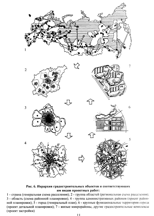 Рис. 6. Иерархия градостроительных объектов и соответствующих им видов проектных работ представляет собой систему, в которой каждый уровень отвечает за определённую территорию и выполняет свои функции. На верхнем уровне находится страна, для которой разрабатывается генеральная схема расселения. Она определяет общую концепцию развития территории и распределение населения по регионам. На следующем уровне находятся группы областей, для которых разрабатывается региональная схема расселения. Она учитывает особенности каждой области и определяет общие принципы развития региона. Далее идёт уровень области, для которой разрабатывается схема районной планировки. Она определяет распределение населения и объектов инфраструктуры внутри области.