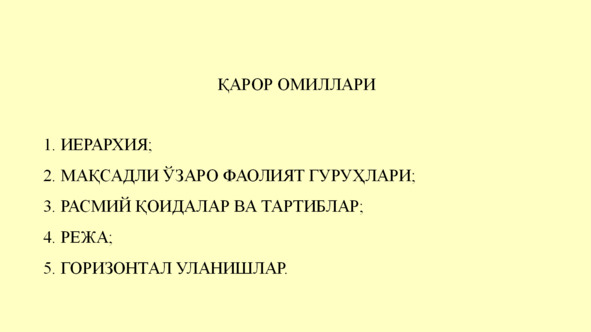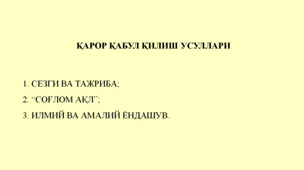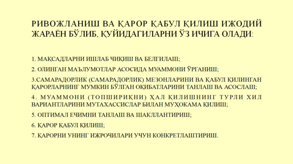– белгиланг ва қарор қабул қилинг турли тубдан янги саволлар.