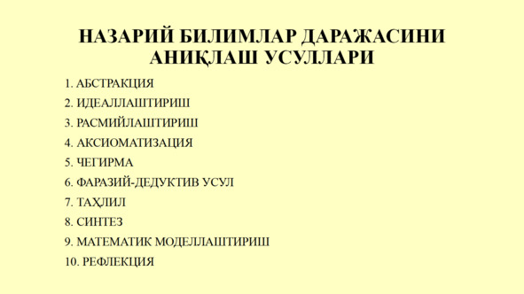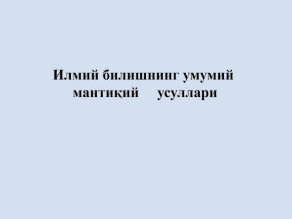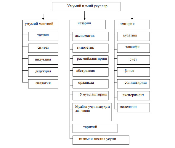 Умумий илмий усуллар умумий мантиқий назарий эмпирик таҳлил, синтез, индукция, чегирма, аналогия, аксиоматик, фаразий, расмийлаштириш, абстракция оралиғида, умумлаштириш тарихий тизимни таҳлил қилиш усули, кузатув тавсифи, текшириш, ўлчов, солиштириш, тажриба, моделлаштириш.