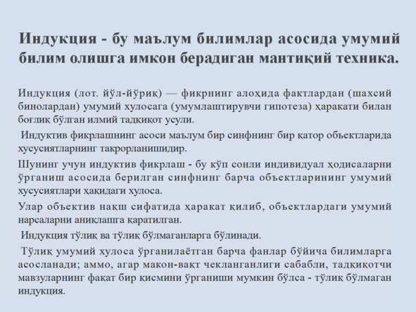Индукция – фикрнинг (идрокнинг) фактлардан, алоҳида ҳаракатланиши ҳолатлар умумий позицияга. Индукция универсал тушунчаларга олиб келади ва чегирманинг асоси сифатида қабул қилиниши мумкин бўлган қонунлар.