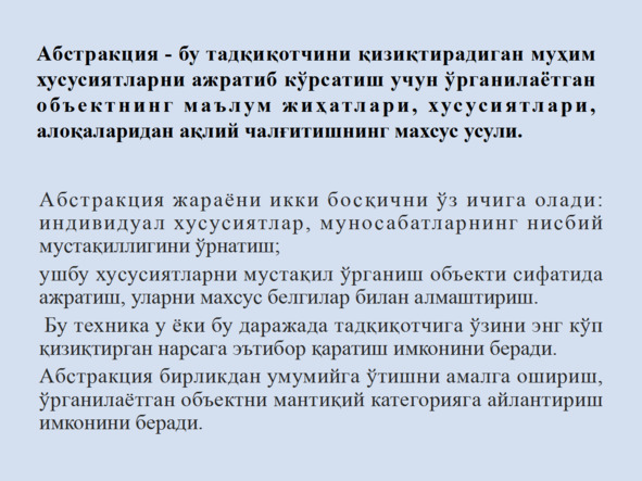 Aбстракция – бу иккинчи даражали фактлардан чалғитиш ўрганилаётган ҳодисанинг энг муҳим белгиларига эътибор қаратиш.