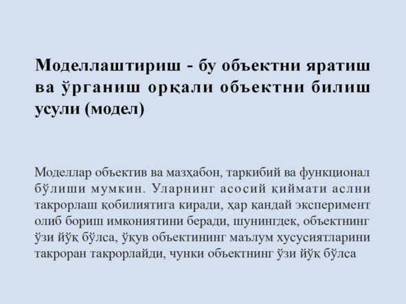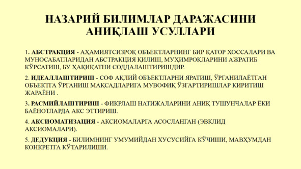 Умумлаштириш – объектларнинг умумий хусусиятлари ва муносабатларини ўрнатиш ва ҳодисалар;
