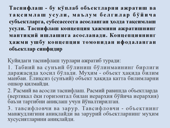 – асосий нарсани акс эттирувчи умумий тушунчанинг таърифи;