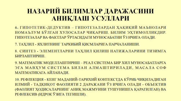 – эмпирик тадқиқдан мантиқий умумлашмаларга ўтиш, олинган фактик материални таҳлил қилиш ва назарий қайта ишлаш.