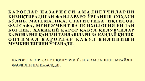 – улар ўртасида мустаҳкамланган маълум хусусиятларга эга. Ушбу концепция асосида муносабатлар ҳисобга олинади, энг яхши қарорни қабул қилиш учун муқобилларни миқдорий таққослаш; баъзи бир мезон бўйича баҳолаш, ўлчанадиган самарадорлик, ишончлилик, сифат ва бошқалар.
