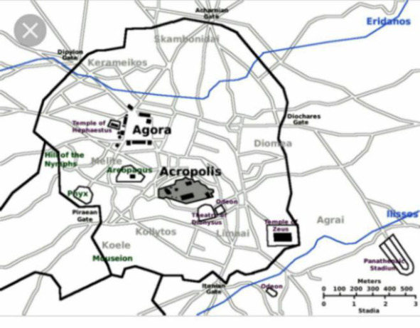 Бош шаҳар теварагида бир хилда тарқалган деҳқончилик ерларининг маркази бўлган 12 қасаба жойланади. шаҳар аҳолиси чамаси 3040 минг киши бўлиши керак. Аҳоли сони доимий бўлиши зарур, кўпайса янги давлат тузилиши зарурати туғилади, ҳоким Клисфен (мил. ав. 510— 509 й.) уруғ қабилага қараб шаҳарни – 4 филга бўлган.
