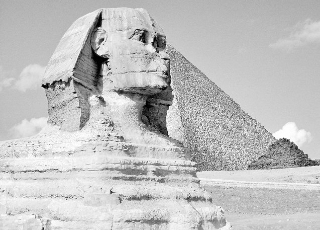 До Хеопса пирамиды было принято строить в Дахшуре, местности, находящейся примерно в сорока километрах от Гизы. Но Хеопс решил построить пирамиду на новом месте, где она могла сиять, не будучи затмеваема другими постройками. Изначальная высота пирамиды составляла около ста сорока семи метров (ныне она на десять метров меньше), а каждая из сторон основания, если считать с не сохранившейся до наших дней облицовкой из известняка, превышала двести тридцать два метра. Пирамида Хефрена после постройки была на три метра меньше пирамиды Хеопса, но сейчас разница между двумя усыпальницами составляет менее метра, так что снизу они выглядят одинаковыми. Зато вдобавок к своей пирамиде, Хефрен повелел высечь из известковой скалы Великого сфинкса – лежащего льва с человеческой головой, которой, как принято считать, были приданы черты Хефрена. Эта монументальная статуя, длиной более семидесяти метров и высотой двадцать метров, считается самой большой монолитной скульптурой в мире. История Великого сфинкса неясна, она состоит из одних лишь догадок и предположений. С кем только его не отождествляли, но истина погребена под прахом времен и вряд ли будет открыта…