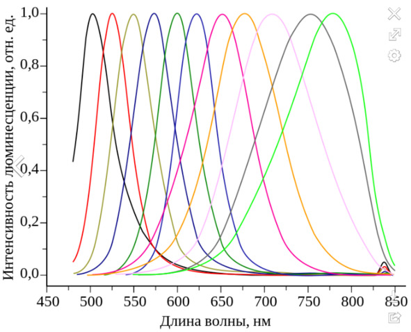 Данный элемент кроме того обладает свойством флуоресценции, но достигает своего пика только при 790 нм. Настоящий закон действенен только для массивных кристаллов, когда же их размер сравнительно уменьшается и может доходить до состояния приведения в квантовые точки, пик флуоресценции начинает смещаться на определённое значения, находясь уже на ультрафиолетовый диапазон. Больше всего эту зависимость олицетворяет спектр флуоресценции теллурида кадмия для различных размеров, где размер коллоидных частиц увеличивается примерно от 2 до 20 нм, а в лице причины такого смещения пика представляется некоторая квантовая яма (Рис. 2).