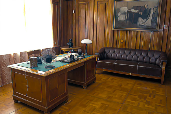 Потом повернувшись к двери крыла его отца, он прошёл по коридору и услышав звонкое чиканье печатной машины прошёл к открытой двери личного кабинета. Личный кабинет, обитый деревом с небольшой люстрой, большим выглядывающим в сад окном, закрытый белыми шторами, имел в себе красивый массивный стол с двумя полками по обе стороны, на полу был постлан небольшой ковёр, слева рядом с напольными часами находилось небольшое кресло и диван в комплекте, над которыми висела картина дальнего поля, где вдали бегут лошади. На столе имелась серединная часть, обитая тёмно-синем материалом, справа находились настольные часы, небольшой электрический вентилятор, отдельный комплекс с чернильницей, пером, двумя промокашками, двумя чернильницами, перекидным календарём, отдельной записной книжкой, стационарным телефоном и настольной лампой.