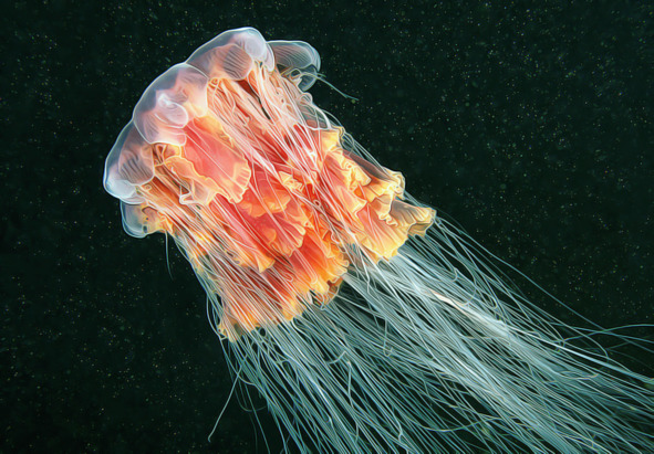 Вот совсем скоро, на средней глубине порядка 300 метров им удалось встретить настоящую арктическую Цианею. Это была огромная, просто гигантская медуза, мирно плавающая, с самыми причудливыми движениями. Она имела почти прозрачный красивый купол, светло-синего и всё более синеватого к концам окраса, вновь становящийся светлее под ним. Говоря же о тысячах щупалец, то они скорее в центре, в основной гуще скорее напоминали сгусток синего облака, когда же другие мириады её щупалец, были похожи на тончайший беловатый дым.