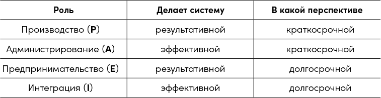 Чтобы организация была эффективной и результативной как в краткосрочной, так и в долгосрочной перспективе, принципиально важны четыре роли. Они необходимы для успеха организации точно так же, как витамины для здоровья организма. Если какая-то роль исполняется плохо, организация начинает «болеть». (Эти недуги рассматриваются в моей книге о жизненном цикле компаний[8]. Здесь же мы будем говорить лишь о том, как они сказываются на управлении.)