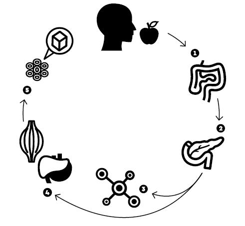 1. Пища расщепляется пищеварительной системой на глюкозу, которая используется в качестве энергии.