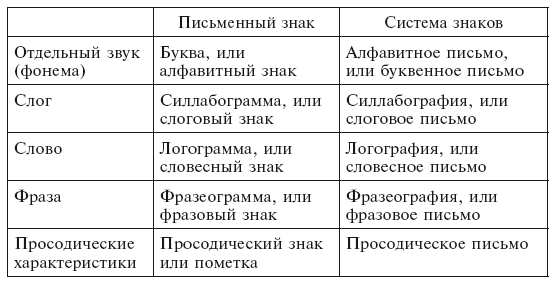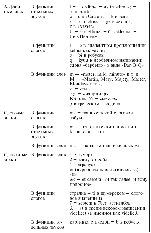 Письменность ни в коей мере нельзя считать точной копией устной речи. Письменность никогда не достигала такого идеального состояния строгой эквивалентности, в котором одну единицу речи выражал бы один знак и один знак выражал бы только одну единицу речи. Даже алфавитное письмо, наиболее развитая форма письменности, полно противоречий в соответствиях между знаками и звуками. Непоследовательность фонетического письма проиллюстрирована на рис. 3. В то же время таблица указывает на различия между историческим и функциональным характером письменности.