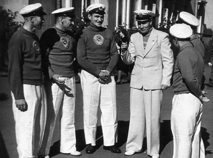 Чемпионы СССР 1949 года: в классе Л-4 И.П. Матвеев (в белом костюме), левее Г.С. Назаров (в классе Л-3).