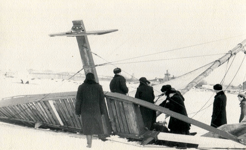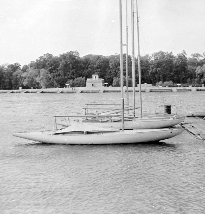 В день празднования открытия летней спортивной навигации яхт-клуба ВЦСПС 1956 года для участия в параде судов Юра взял меня матросом на свой «Ерш», вот тут-то и состоялось моё первое «оморячивание». Подул сильный шквал, мы чуть не перевернулись, справиться было почти невозможно, но я толком то и испугаться не успел, как мы выбросились на берег речки «Керосиновка». Я знал, что швертботы переворачиваются, и этого я как раз и боялся, но не знал, что у «Ерша» такой узкий кокпит, что, перевернувшись швертбот не заливается водой и, встав на шверт, его можно поставить. Однако в данном случае, чтобы не куролесить на виду у всех в парадной гавани, учитывая моё «невероятное мастерство швертботиста», Юра принял самое правильное решение.