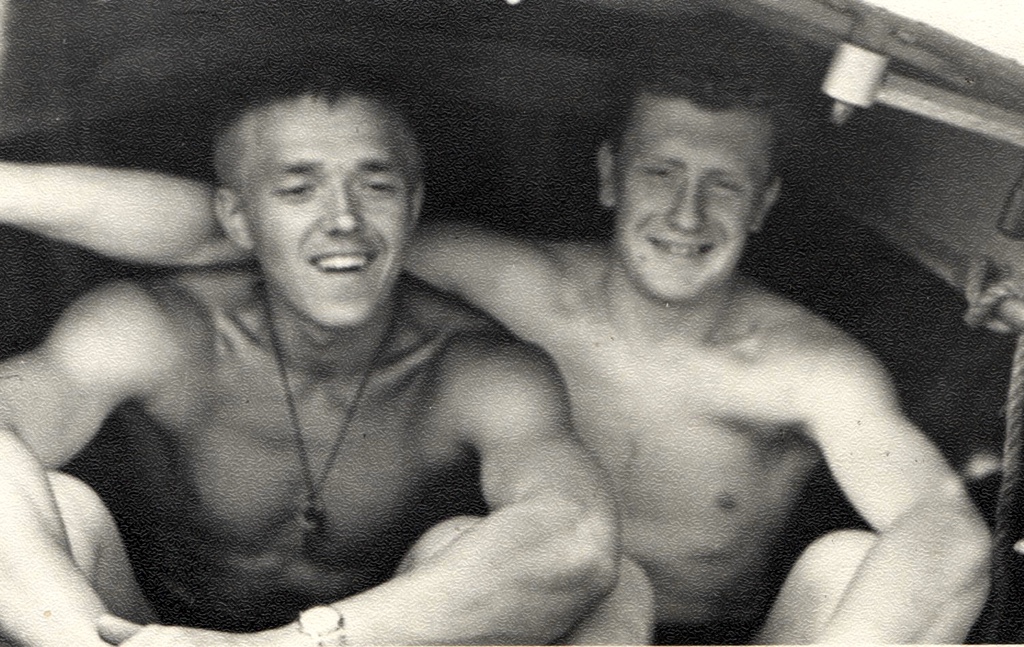 Мой превосходный начинающий матрос и друг, перворазрядник ватерполист Василий Алыпов со мной под козырьком «дракона» №385 «Восток» (яхт клуб» Водник», 1963 год).