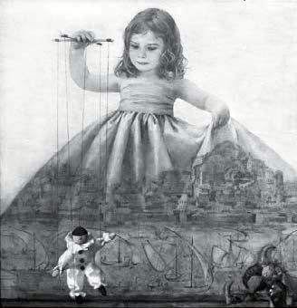 Во-вторых, кукла помогает продемонстрировать, как с помощью отдельно взятой вещи можно манипулировать сознанием, конструируя при помощи игровых практик с ее участием частные поведенческие навыки и стереотипы, которые затем при помощи языковых образов и клише распространяются на более общие социальные практики. Кукла играет важную роль в формировании особых «сверхидей» или «социом», таких, например, как идея «кукловода» («манипулятора»), а также связанных с ней идей «социального манипулирования» и «социального конструирования» – см. илл. 5, Т. Чувашева. Игра для инфанты (2007). При этом в роли «кукловода» – манипулятора может выступать как отдельная персона (от божества до вождя), так и социальная группа или ее символические замены, своеобразные «социальные симулякры».