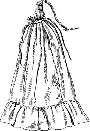 Куклы похожей конструкции характерны для многих культур. Например, основу игровых кукол кыдак у шорцев составлял стержень из плотно свернутой бумаги или ткани, который обертывался цветной материей. Сверху на эту конструкцию надевали одно или несколько платьев, которые закреплялись «поясом» из ленточки – см. илл. 9 [Иванов 1979, с. 9, рис. 2, шорцы]. У кумандинцев игровые куколки, изображавшие мужчин и женщин разного возраста, изготавливали из холста, кудели и лоскутков ткани. Основу каждой куклы составлял скатанный из кудели валик, обшитый холстом. Особое внимание уделялось тщательной имитации одежды [Иванов 1979, с. 24, рис. 20]. Игровые куколки телеутов представляли собой тугой матерчатый валик, завернутый в одну или несколько тряпочек, изображающих одежду. У некоторых кукол он обертывался бумагой и полосками цветной ткани на месте лица [Иванов 1979, с. 43, рис. 43].