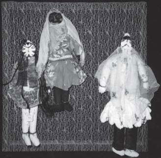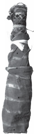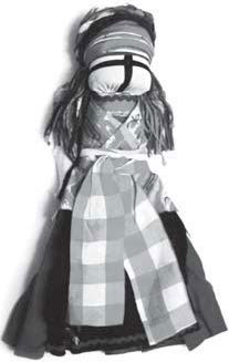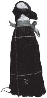 Близкие по конструкции куколки известны в разных культурах. Например, у челканцев сшитые из тканей небольшие куколки куртыяк («старуха», «жена», «хозяйка»), считавшиеся хранительницами дома и семейного благополучия, представляли собой прикрепленные к прутику лоскутки пропитанной маслом конопляной ткани [Иванов 1979, с. 79–33]. Русским также были известны куклы-«пеленашки», конструктивной основой которых были чурочки или прутики – см. илл. 13–14 [ТНК 2009, с. 33, д. Спаска Угря Перемышльского и Прудки Жиздринского у. Калужской губ.].