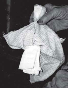 В некоторых конструкциях русских кукол тряпку не скатывали, а сворачивали: сначала брали кусок материи по центру в кулак и скомкивали нижнюю часть, натягивая образовавшиеся складки назад, сворачивали несколько раз, вдвое, втрое, а затем из верхней части формировали головку. Иногда головку формировали отдельно. «У меня у самой были-то еще маленькие куколки вот. Делала из лоскутков. Да. Вот этак [скомкивали]: это, например, головка была. Отдельно. Потом сюда привязывали ещё несколько лоскутков – это было туловище. А потом к туловищу маленькие рукава пришивали. И можно было просунуть сюда [веточку], чтоб ручки были. Вот. А потом к этому концу пришивали ножки…» [ЛА МИА, д. Горицы Трубчевского р-на Брянской обл.]. Нередко для быстрого изготовления куклы-однодневки использовали платок [ЛА МИА, д. Мякинницино Великоустюгского р-на Вологодской обл.], ср. также «быструю» куклу-скрутку, изготовленную для нас А. М. Ситковой в 2001 г. – см. илл. 10 [ЛА МИА, д. Вяжновка Красногорского р-на Брянской обл.]. Г. Л. Дайн называет такого рода кукол «пеленашками» [Дайн 2001, с. 106, 107].