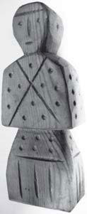 Куклы на основе деревянных чурок («панки»), известные по археологическим находкам эпохи русского средневековья [Долгов 2006, с. 79], как и в XIX–XX веках [Чекалов 1974], чаще всего употреблялись в детских играх – см. илл. 16, кукла-«панок», изготовленная Д. Москиным [ЛКЭСК МИА, музей-заповедник «Кижи»; см. также цв. вкл. 4]. У Г. Л. Дайн они названы «куклами-столбиками». Деревянные куколки обычно вытесывались из чурки топором или ножом, причем придававшиеся им формы были довольно условными знаками человека или животного [Дайн 1981, с. 25–26; Дайн 2001, с. 102, 103] – см. илл. 17, кукла-«столбушка» [ЛКЭСК МИА, Орловская обл.]. Подобные разновидности кукол фиксируются в различных районах Русского Севера [Дайн 2007, с. 12]. «А куклу штё? Сделают такую штучку деревянную да и голову сделают, и всю наредят, как те следует. И с ногами, и всё. ‹…› А штё ли? Из полена сделают да и всё. Чево тутока? Ножки такие, ручки такие приколачивали. Эдакиё ручки сделают маленькиё и всё ей тут сделают. Это вытясовали, гли-ко ножичком вострым…» [ЛА СИС, д. Ивановский Починок Великоустюгского р-на Вологодской обл.].