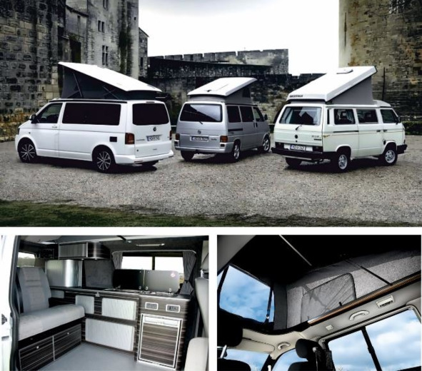 Рисунок 1.9. Вверху: все поколении линейки автодомов «Westphalia», модификации «James Cook». Внизу: внутреннее пространство со стороны кабины и спальное место.