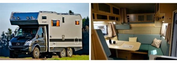 Рисунок 1.12. Экспедиционный автодом немецкой фирмы «Bimobil» и один из вариантов интерьера внутри. Кабина не соединяется с жилым отсеком.