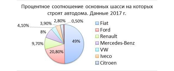 Прежде, чем приступить к производству автодома, изготовитель выбирает: на каком базовом шасси будет строиться будущий дом на колесах, которое обусловлено популярностью и спросом. Ниже приводится график шасси автомобилей Европейских производителей, на базе которых строятся автодома. Эта диаграмма наглядно показывает процентное соотношение шасси на рынке домов на колесах. Данные немного устарели, но «расклад» не сильно изменился.