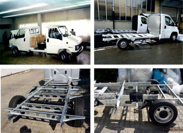 Рисунок 3.7. Шасси, которые поступают на производство автодомов. Сверху слева – только кабины. Сверху справа – рессорное шасси, без задней стенки для постройки автодома п/м более 3500 кг. Внизу – слева облегченное и расширенное шасси для автомобиля п/м менее 3500 кг. Внизу справа – пример скрепления шасси болтами.