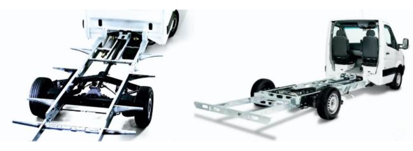 Рисунок 3.8. Заднеприводное шасси «Mercedes-Benz» подготовленное для производства автодома. Слева- на раме стороннего производителя. Справа – удлинение основной заводской рамы.