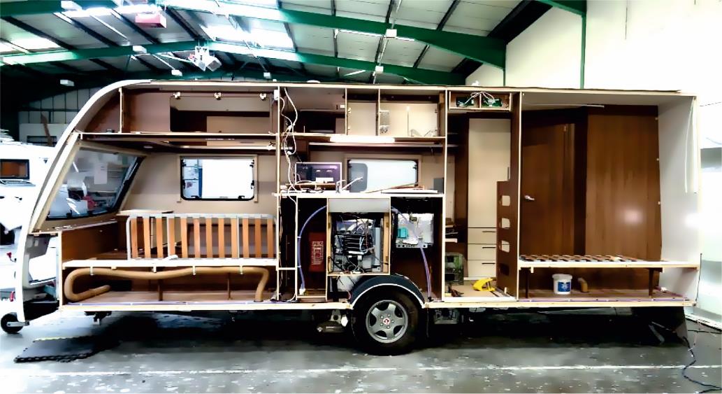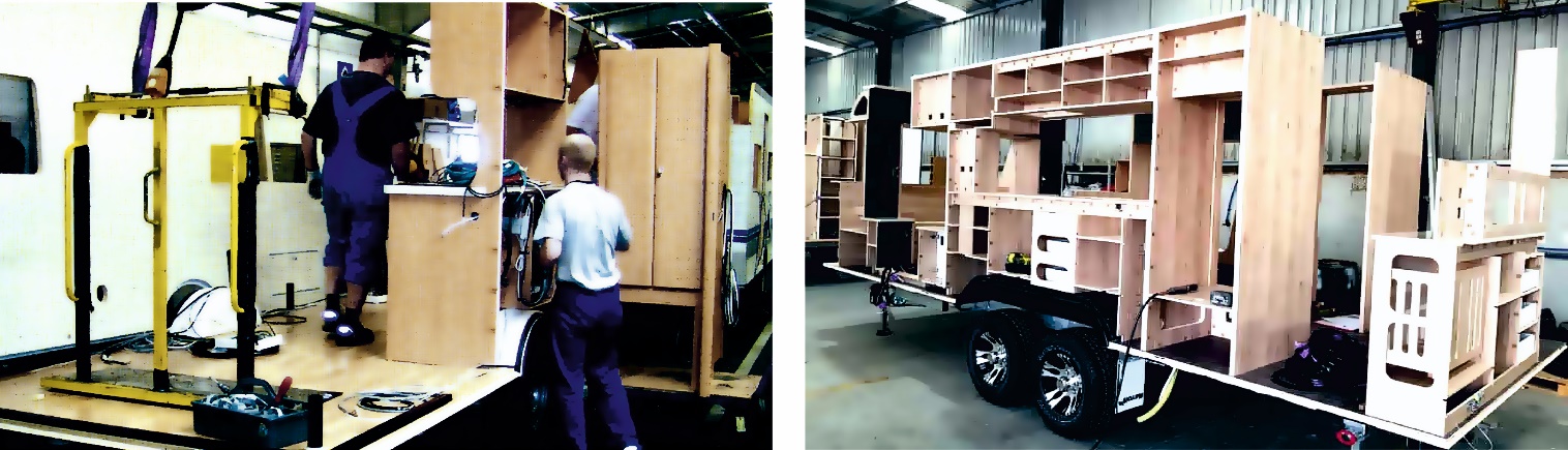 Прежде, чем установить стены, на них монтируют навесные детали и полочки, которые не будут соприкасаться с никакими вертикальными поверхностями и стенками, например, с вертикальной панелью душевой кабины или шкафа. Так же возможна установка радиаторов жидкостного отопления, если такое предусмотрено моделью каравана.7 Когда все готово, происходит монтаж стен каравана.