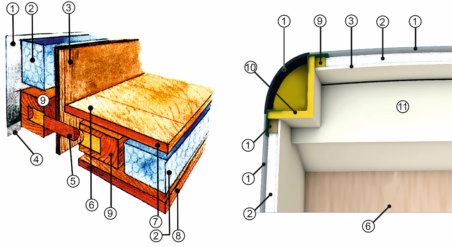 Рисунок 3.1. Сэндвич-панель в разрезе. Слева – сопряжение пола и стены. Справа – боковых стен. 1 – Наружное алюминиевое покрытие или рулонный пластик; 2 – утеплитель, 3 – внутреннее покрытие; 4 – Нижний алюминиевый кант для защиты от брызг; 5 – соединительный деревянный шкант; 6 – декоративное половое покрытие; 7 – фанера пола; 8 – ламинированная фанера; 9 – деревянная закладная сэндвич – панели; 10 – полиуретановый уголок; 11 – декоративная пластиковая панель.